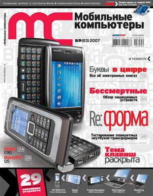 Читайте в свежем номере журнала Мобильные Компьютеры: - Re:Форма – Тестирование планшетных ноутбуков-трансформеров. - Всепогодный офис: Обзор защищенных «неубиваемых» девайсов. - Буквы в цифре: Все об электронных книгах. Описание устройств и приложений для мобильного чтения. - «Заточенный» - значит удобный: Тонкая настройка Windows Mobile. Что сделать чтобы не "висло" и "не тормозило". - Фотошопинг на досуге: Навыки работы с Adobe Photoshop CS3. - ТЕСТЫ: RoverPC Q5, HP iPAQ 514 Voice Messenger, Nokia N800, Nokia E90, Pocket Navigator 4000 Advanced, MSI PR210, RoverBook Navigator V211VHP, Dell Inspiron XPS M2010, Samsung Sens X22.