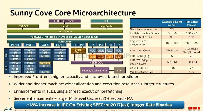 Компания Intel посвятила вступительную презентацию на виртуальной конференции Hot Chips 32 рассказу о процессоре Xeon Scalable следующего поколения, известному под кодовым наименованием Ice Lake-SP. Этот процессор, рассчитанный на выпуск по 10-нанометровому техпроцессу, представляет собой первое использование ядра Sunny Cove в процессорах корпоративного сегмента. Переход на Sunny Cove обеспечивает прирост показателя IPC по сравнению с ядром ? Skylake, которое Intel использует в микроархитектуре процессоров Xeon с 2015 года. Хотя реализация ? Sunny Cove для Xeon мало отличается от реализации для мобильных процессоров Ice Lake-U 10-го поколения, она учитывает иерархию кэш-памяти и топологию кристаллов, принятую для процессоров Intel корпоративного сегмента.