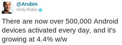 Вице-президент компании Google Энди Рубин, возглавляющий отдел по разработке мобильной платформы, в своем Twitter официально заявил, что его подразделение достигло очередного важного этапа в своем развитии. По его словам, с момента выхода Android на рынок до 10 мая этого года было активировано более 100 миллионов устройств на базе этой системы. Кроме того, Рубин сообщил, что на сегодняшний день Google ежедневно активирует 500 000 устройств на базе Android, причем каждую неделю эта цифра растет в среднем на 4,4%. Это свидетельствует о том, что данная мобильная платформа продолжает завоевывать мир, невзирая на жесткую конкуренцию в данном сегменте рынка. Эксперты подсчитали, что если компания продолжит активировать 500 тысяч устройств Android в день, к концу следующего года общий объем продаж может достичь 182,5 миллиона гаджетов. Естественно, если вышеуказанный еженедельный прирост в размере 4,4 процента сохранится, то данная цифра может оказаться еще больше.