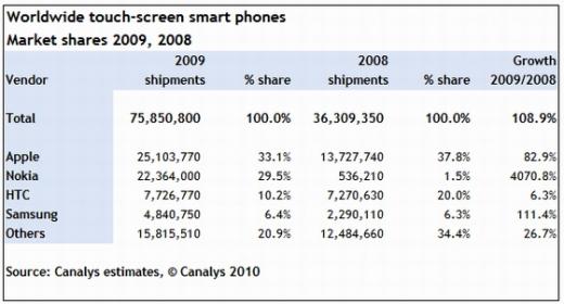 Около 30 млн коммуникаторов с тачскрин экраном было продано в четвертом квартале 2009 года это на 138% больше чем за тот же период прошлого года. Таким образом 55% смартфонов и коммуникаторов проданных за этот период оснащены тачскрин. Впервые количество проданных устройств с тачскрин превысило половину всех продах смартфонов и коммуникаторов. Согласно данным Canalys более 75 млн тачскрин аппаратов было продано за 2009 год, в то время как общее количество проданных смартфонов составило 166 млн. Основные производители тачскрин коммуникаторов 2009 года: - Apple – 25.1 млн устройств