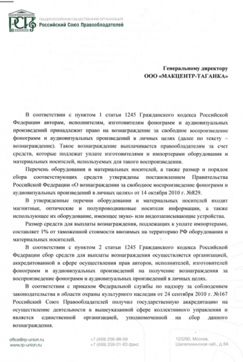 Наша компания на днях получила официальное письмо со следующим содержанием вкратце. Организация, именуемая себя Российским Союзм Правообладателей, в настойчивой форме предлагает выплачивать ей 1% от стоимости импортируемых товаров, способных воспроизводить музыку и изображения. В качестве правовой базы такого предложения указывается постановление №829 Правительства РФ. Мы расцениваем данную инициативу как неразумную и вредоносную, поскольку она приведет к тому, что законопослушным пользователям придется расплачиваться за пиратов. С другой стороны, у пиратов появится оправдание своей незаконной активности, поскольку налог в пользу абстрактных авторов уплачен, зачем же платить еще раз за лицензионный продукт? Всего союз Никиты Михалкова, по собственной оценке, может собирать с импортеров аудио- и видеотехники, компьютеров, телефонов, флешек и дисков в год до $100 млн. Недавно правительство определило, что импортеры должны перечислять на эти цели 1% от стоимости ввезенной в Россию техники и дисков. Еще ссылки по теме: