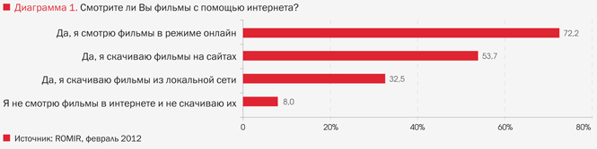 Как показало исследование, только 8% опрошенных не смотрят фильмы в интернете и не скачивают их. Все остальные прибегают к трем основным способам интернет-кинопросмотра: почти три четверти респондентов (72%) смотрят фильмы в режиме онлайн, больше половины (54%) скачивают их на интернет-ресурсах, а еще треть участников исследования (33%) – в локальных сетях, большинство из которых дают возможность своим пользователям бесплатно обмениваться цифровым контентом.