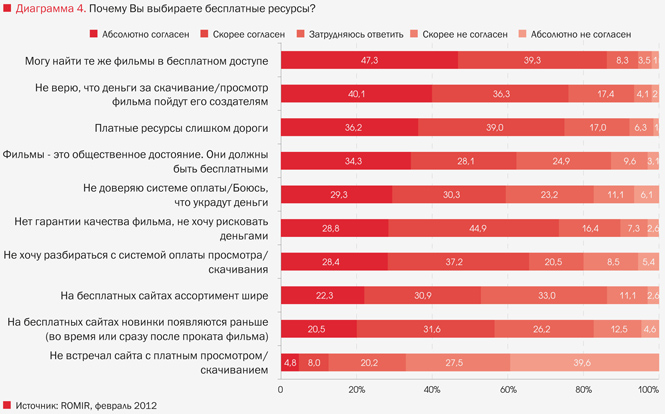 Большинство пользователей (47%) объясняют свою приверженность бесплатным интернет-ресурсам вполне логичным соображением – последние содержат все те же фильмы, что и их платные аналоги. Чуть менее популярными стали еще два аргумента в пользу бесплатного просмотра – неверие респондентов в то, что заплаченные ими деньги дойдут до правообладателей, и высокая цена просмотра. Еще треть респондентов (34%) считает фильмы общественным достоянием. При этом крайне низка доля тех, кто не сталкивался с платными сетевыми ресурсами (5% опрошенных), что говорит об абсолютно сознательном обращении интернет-пользователей к их бесплатным аналогам.