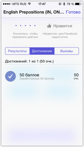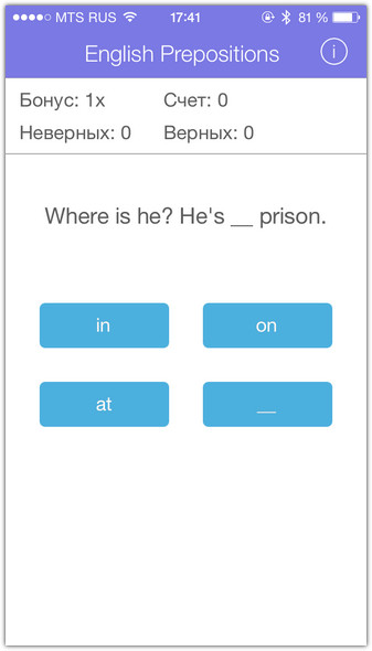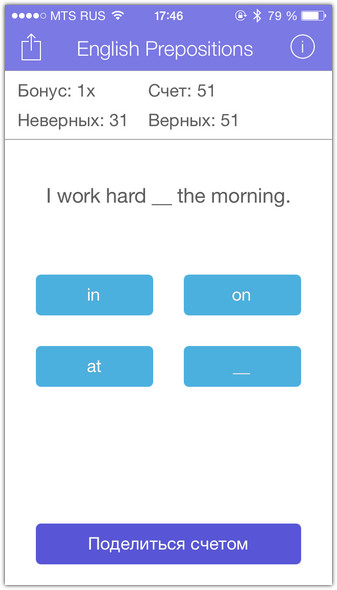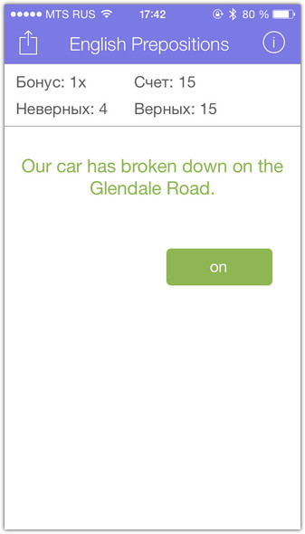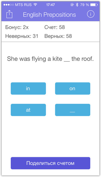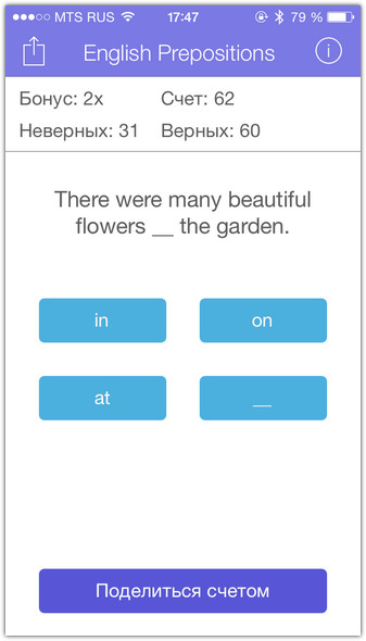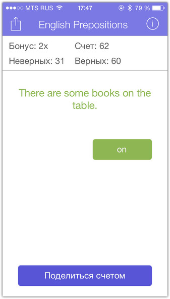 Давать правильный ответ полезно не только для обучения. Вы играете на очки. Угадал — получаешь одно очко. За каждые десять удачных ответов подряд, призовой модификатор увеличивается на единицу. Итоговый счёт никогда не обнуляется: игра не имеет конца, разве что вы намертво вызубрите английские предлоги и перестанете делать ошибки. Ваш нынешний счёт публикуется в Game Center, где свои достижения можно сравнить с друзьями. И похвастаться, конечно.