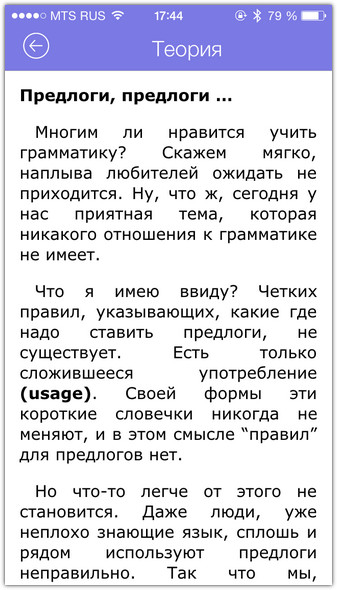 Вид ПО: Обучающая игра/иностранные языкиРазработчик/Издатель: Vitaly LeventhalВерсия: 1.0iPhone + iPod touch: Бесплатно [Скачать из App Store] Игры редко учат чему-то хорошему. Что полезного вы узнали, кидая птичек в Angry Birds или набегая на врагов в Clash of Clans? Другое дело — обучение иностранному языку в игровой форме. Приложение English Prepositions учит пользователя правильно подбирать предлоги в предложениях на английском языке. Думаете, что отлично всё знаете? Сейчас проверим.