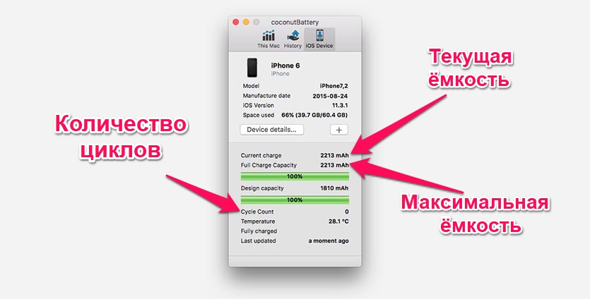 Теперь нужно проверить количество циклов батареи и заявленную емкость.