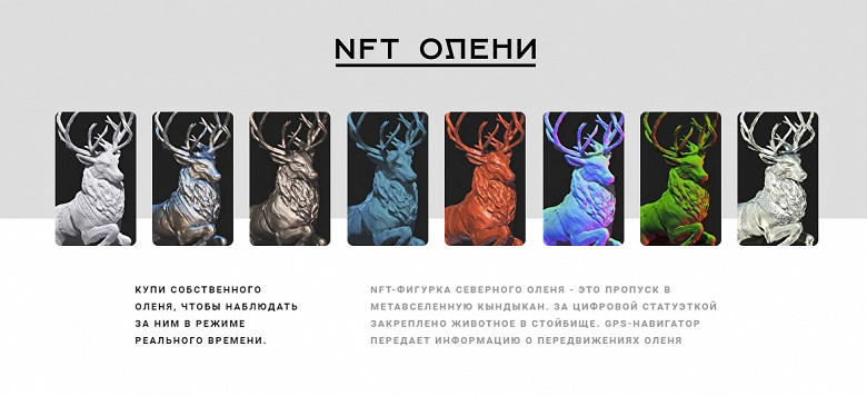 Знаковым моментом проекта стало создание NFT коллекций оленей и их продажа, а также выпуск фьючерсов на поставку оленьих пантов (панты — это растущие рога, они покрыты бархатистой кожей и пронизаны кровеносными капиллярами, питающих их, чтобы они росли большими и крепкими). Покупатель может дать реальному животному имя и стать его владельцем. За купленным оленем можно наблюдать в режиме онлайн с помощью GPS-трекера. Своему оленю можно будет покупать и дарить подарки, отметили авторы проекта. Также возможно запрашивать его фото и видео в реальном режиме. Вырученные от продажи средства пойдут на поддержку лагеря оленеводов.