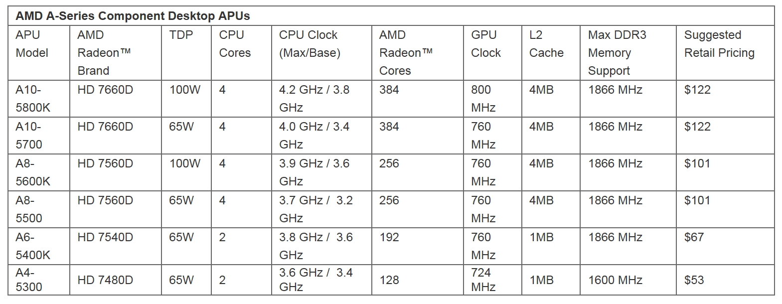 Действительно, стоимость гибридных процессоров AMD A-Series второго поколения для настольных компьютеров варьируется в пределах от $53 до $122, причем, самая доступная модель A4-5300 может предложить два вычислительных ядра с частотами 3,4/3,6 ГГц (базовая/турбо), 1 МБ кэша второго уровня, контроллер памяти DDR3 1600 и встроенную графику с 128 потоковыми процессорами. Что касается более высококлассного чипа A6-5400K с двумя ядрами, частотами 3,6/3,8 ГГц и 1 МБ кэша второго уровня, он стоит $67.