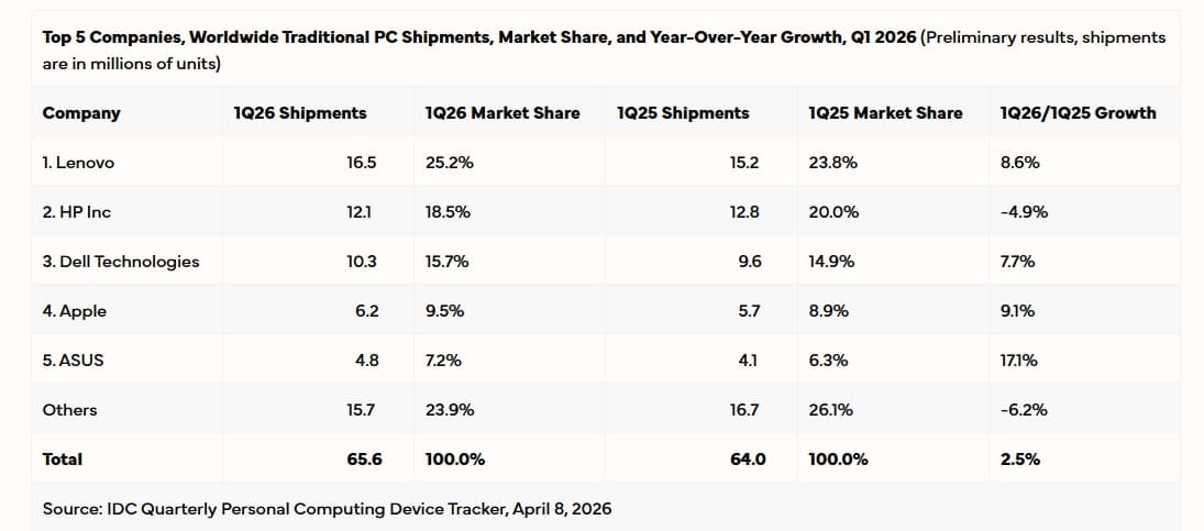 По итогам первого квартала лидером мирового рынка ПК была Lenovo с долей 25,2%, а в пятёрку лучших также вошли HP, Dell, Apple и Asus. При этом среди этой пятёрки только HP показала спад продаж в количественном выражении, а Asus и вовсе каким-то образом смогла нарастить продажи на 17,1%.