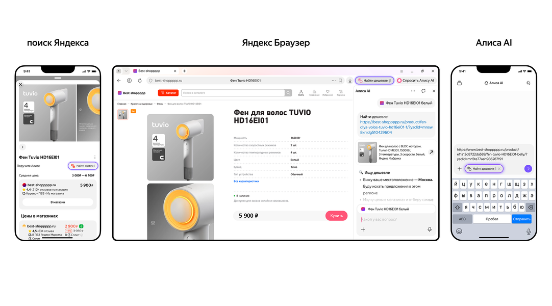Пользователи могут найти выгодные предложения с помощью ИИ, отправив ссылку на товар в приложении «Алиса AI», веб-версии чата с нейросетью или приложении «Яндекс с Алисой AI». Также можно искать товары на ПК в «Яндекс Браузере».