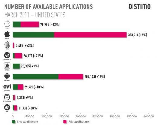 Компания Distimo опубликовала результаты своего исследования рынка программного обеспечения для различных платформ. Согласно этим данным, количество бесплатных приложений для Android составляет 134342, а для Apple iPhone несколько меньше - 121845. По данным Distimo, App Store остается самым большим магазином программного обеспечения, хотя рост его несколько замедлился в последнее время. В то время как рост количества приложений на Android Market развивается большими темпами. Если тенденция сохранится, то к концу года Android Market может обогнать App Store.
