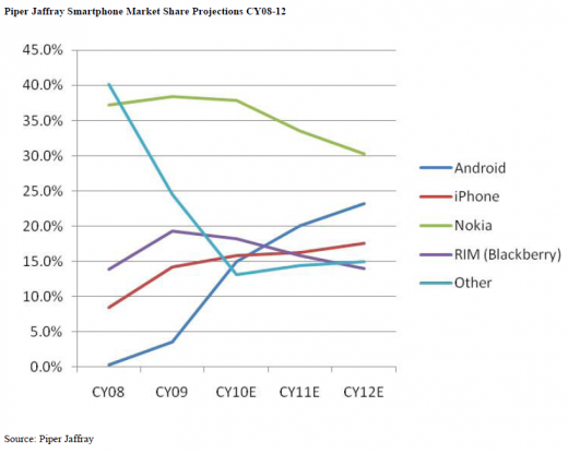 Согласно отчету Piper Jaffray, количество устройств на ОС Android растет очень быстро, и в ближайшие 5 лет эта ОС займет половину рынка коммуникаторов. Apple iOS будет занимать от 20 до 30%. В 2010, по данным аналитиков, Google будет контролировать 14,9% рынка коммуникаторов, а к 2012 года эта цифра вырастет до 23,2%. Прогноз для Apple следующий: 15,9 и 17,6% соответственно. Согласно этим данным, Apple и Android значительно потеснят Nokia и Research in Motion. По некоторым данным RIM думает о переводе своих устройств на ОС от Google. Успех Android объясняется серьезной поддержкой со стороны таких производителей как HTC, Motorola, Samsung.