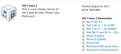 На минувших выходных компания Apple выпустила очередную бета-версию операционной системы iOS 5 под номером сборки 9A5288d. Помимо бета-версии мобильной операционной системы также были стали доступны такие обновления как Xcode 4.2 Developer Preview, iTunes beta и программное обеспечение Apple TV beta. Обновление возможно установить «по воздуху»: эта функция была включена еще с момента релиза четвертой бета-версии iOS beta 4, которую можно было установить аналогичным способом 22 июля. Сообщается, что для установки при помощи такого метода пользователям необходимо удалить всю информацию с их устройств, при помощи сброса на заводские настройки.Также стоит заметить, что при обновлении по беспроводному соединению пользователям будем необходимо загрузить лишь 128 MБ данных, в то время как тем, кто решил обновиться стандартным методом, будет необходимо скачать прошивку объемом 787 мегабайт.