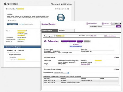 Стало известно, что первая партия смартфонов iPhone 4 уже отправлена со сборочных заводов в Китае, а компания Apple стала сообщать заказчикам о том, что свой товар они получат 24 июня. В системе отслеживания заказов у многих покупателей статус заказа сменился на «готов к отгрузке», а у некоторых же покупателей дата доставки сменилась с 24 на 23 июня. Курьерская служба FedEx ожидает прибытия первой партии устройств уже в ближайшее время, но это не означает того, что она тут же начнет развозить их по домам заказчиков. Apple может попросить компанию придержать товар на складах до официальной даты начала продаж. Тем не менее, если вспомнить, что первые покупатели планшетника iPad получили свой гаджет чуть раньше условленной даты, то вполне возможно, что и сейчас эта история может повториться. Согласно информации о слежении местоположения товара, доставка устройств в США будет осуществляться непосредственно с острова Лантау в Гонконге, а отгрузочный центр FedEx находится в Гонконгском международном аэропорту.