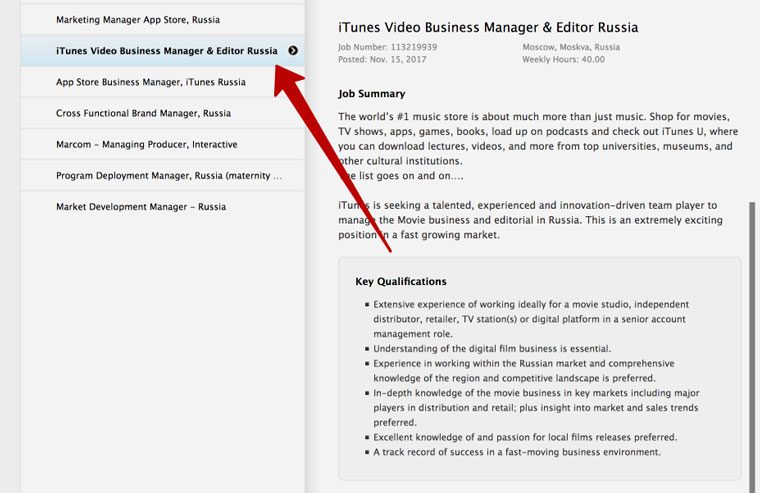 На официальном сайте Apple опубликовала вакансию специалиста, в полномочия которого будет входить налаживание партнерских отношений с киностудиями. Apple интересует человек с большим опытом в киноиндустрии, способный взять на себя управление за видеоконтент и редакцию в России.
