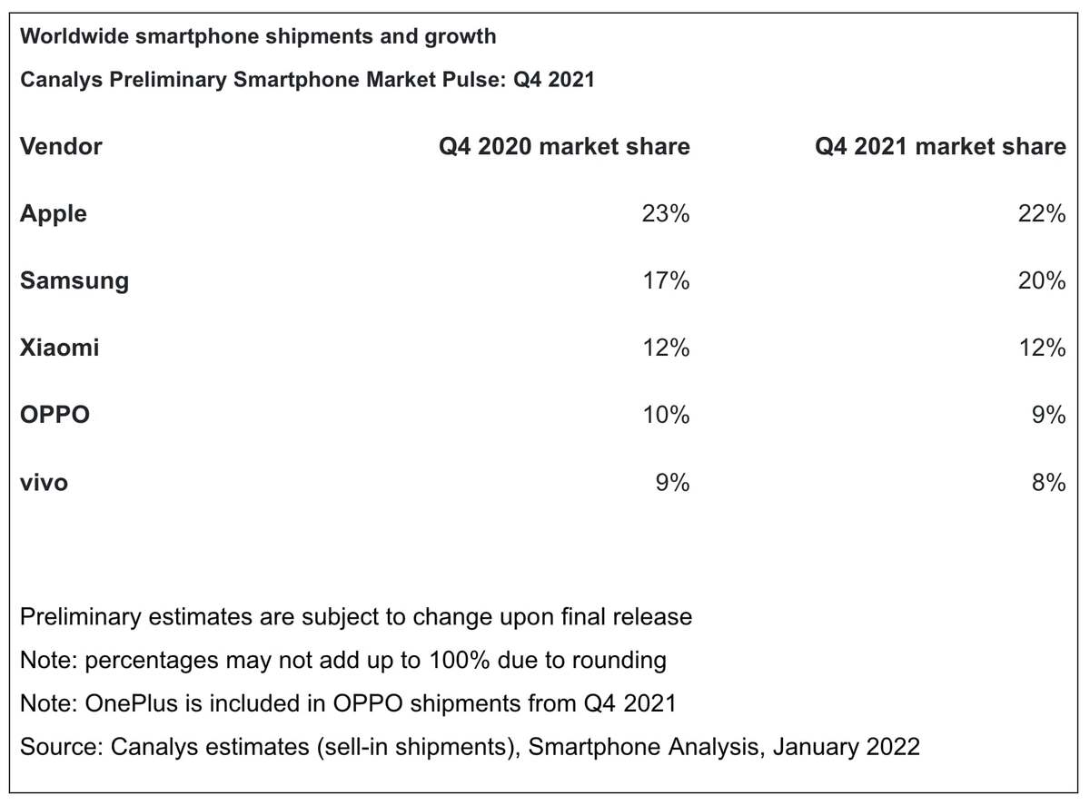 Согласно отчёту Canalys, в четвёртом квартале 2021 года на iPhone пришлось 22% поставок смартфонов во всём мире. Аналитики отмечают высокий спрос на линейку iPhone 13, которая была представлена в сентябре 2021 года.