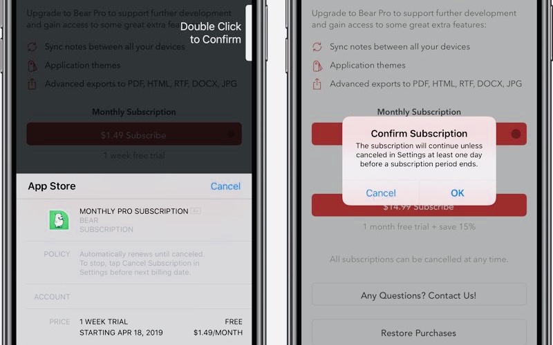Whoa! Apple added an additional confirmation step for subscriptions. This new alert comes after you confirm with Touch ID/Face ID. I hope they address this in a more elegant way in iOS 13, but I«m thrilled Apple took a definitive step to curb scam subscriptions.