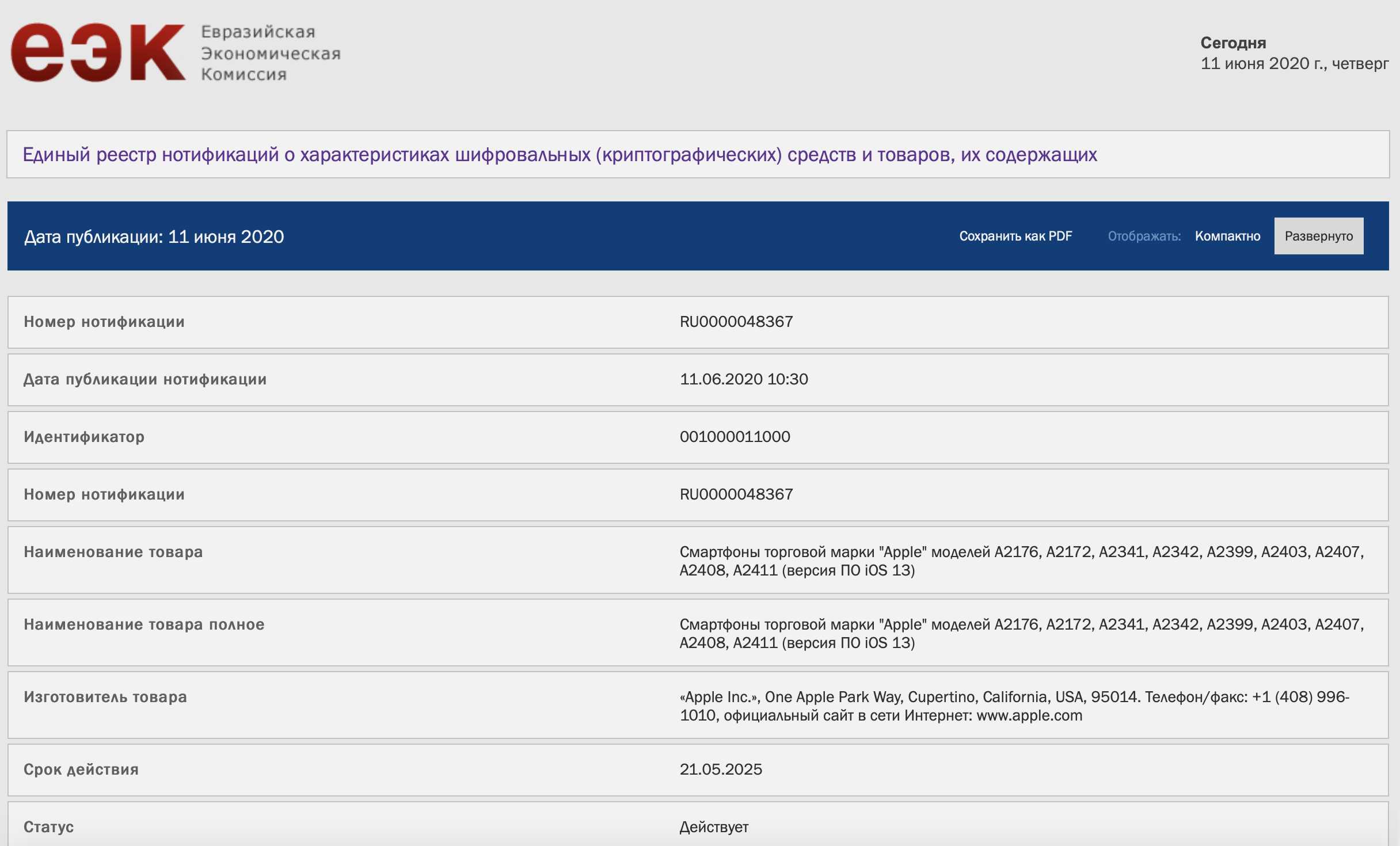 Среди появившихся моделей айфонов указаны A2176, A2172, A2341, A2342, A2399, A2403, A2407, A2408 и A2411. Предполагается, что это может быть iPhone 12 в разных вариациях встроенной памяти.