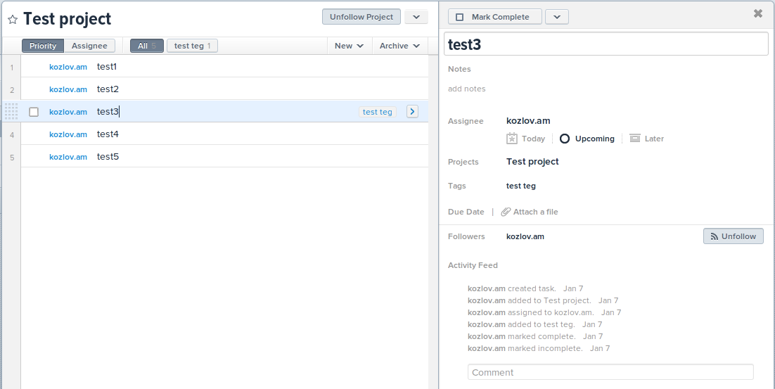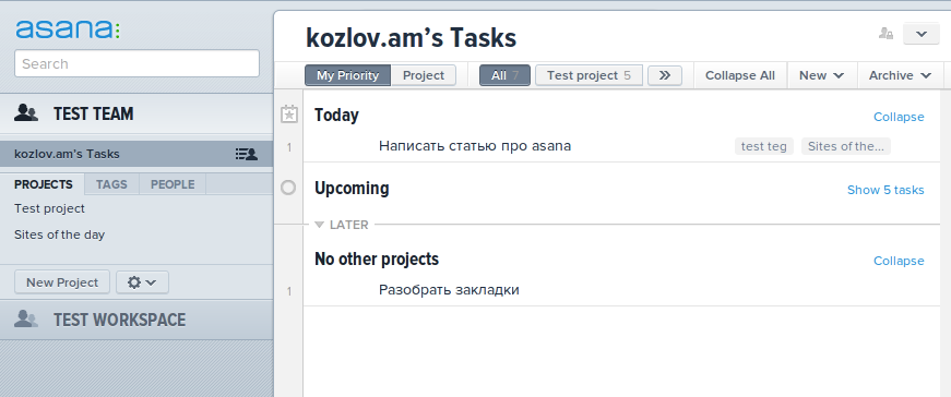 Тестовый проект и тестовая задача на сайте Asana