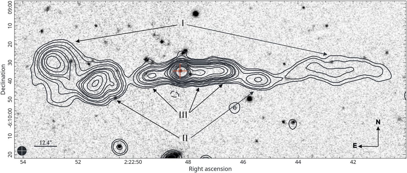 Радиоизображение TDRG J022248−060934, демонстрирующее морфологию, а также положение родительской галактики, обозначенное крестом. Источник: Monthly Notices of the Royal Astronomical Society (2026). DOI: 10.1093/mnras/stag378Согласно спектральному анализу, каждая пара «лопастей» имеет разный возраст. Внешние содержат более старые частицы, тогда как внутренние области свидетельствуют о недавней активности ядра. Первая фаза активности началась около 16 миллионов лет назад и продлилась 10 миллионов лет, за ней последовал миллион лет покоя. Вторая фаза продолжалась 7 миллионов лет, а текущая третья фаза длится 8 миллионов лет.