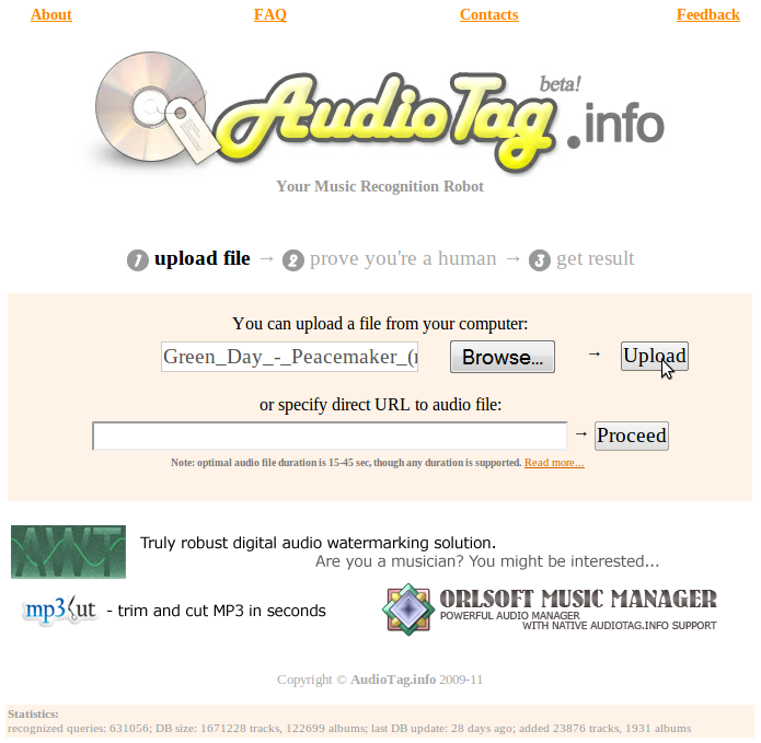 Самый важный плюс AudioTag перед аналогами - это его способность распознавать не по целой композиции, а только по кусочку. Заявлено, что оптимальная длина фрагмента - от 15 до 45 секунд. То есть рингтоны, например, с чужой трубы, можно пробить по AudioTag, а потом уже искать полные версии по точным названиям. Вот, например, вырезаем 30 секунд из песни и загружаем на AudioTag прямо с главной страницы: