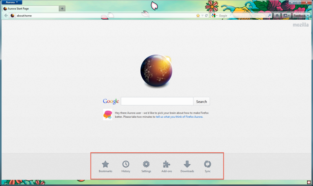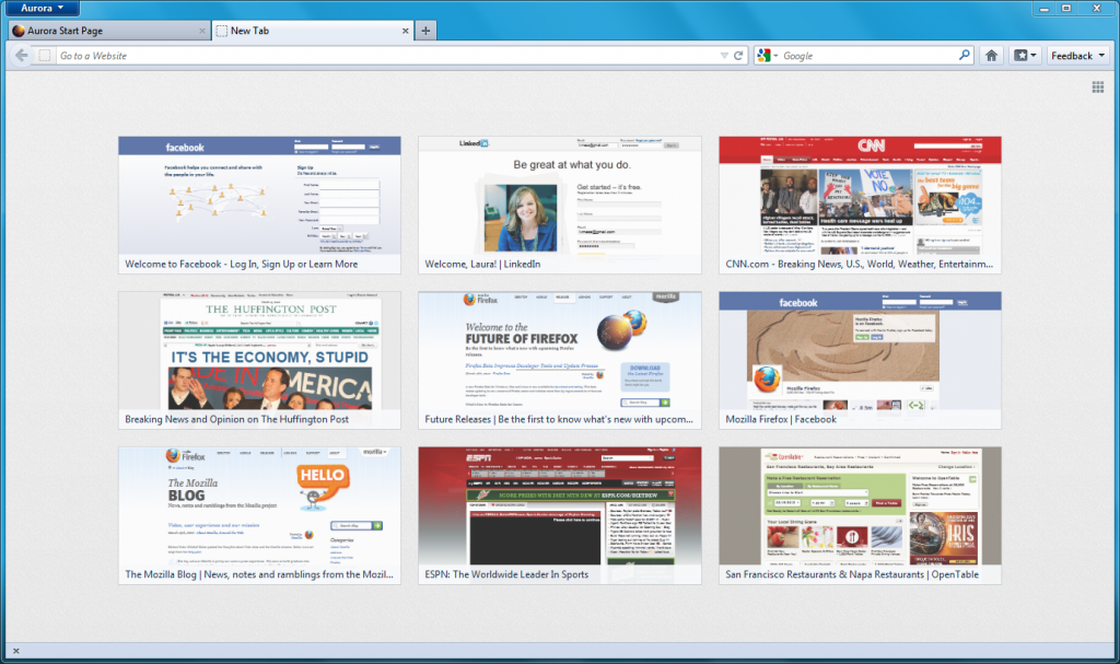 Среди нововведений, реализованных в Aurora-редакции Firefox 13, стоить отметить появление миниатюр недавно посещенных и часто открываемых страниц при создании новой вкладки, а также функцию автозаполнения в адресной строке и переработанную стартовую страницу, предлагающую быстрый доступ к закладкам, история, параметрам, расширениям, загрузкам и опциям синхронизации.