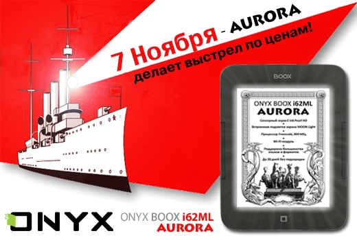 Компания МакЦентр, эксклюзивный дистрибьютор продукции ONYX International на территории России, рада пригласить всех любителей комфортного чтения в фирменный салон электронных книг ONYX BOOX, где 7 ноября можно будет приобрести новую революционную модель с подсветкой экрана по специальной цене в рамках акции «Выстрел Авроры». ONYX BOOX i62ML Aurora, вызвавшая большой интерес как со стороны экспертов, так и со стороны пользователей, является первым официально представленным на российском рынке устройством для чтения электронных книг с экраном E Ink Pearl HD с функцией подсветки экрана MOON Light. С появлением новой модели у любителей книг появилась возможность одинаково комфортно читать на ярком солнце, в условиях плохого освещения и даже в полной темноте. Все посетители фирменного салона электронных книг ONYX BOOX 7 ноября имеют возможность приобрести популярную модель со скидкой 1 000 рублей. Торопитесь, количество устройств, доступных по акции, ограничено. Более подробно с техническими характеристиками новой модели можно ознакомиться на сайте www.onyx-boox.ru, а получить информацию о проводимых акциях можно в блоге www.onyx-boox.livejournal.com.