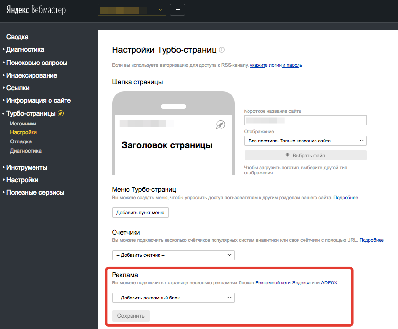 Для того, чтобы воспользоваться этим методом, нужно просто ввести ID рекламных блоков в настройках Турбо-страниц в Вебмастере для фидов. В этом случае первый ID будет показывать рекламу для первого рекламного блока, второй — для второго, и так далее. Для того, чтобы сравнивать статистику с рекламных блоков на разных позициях, мы рекомендуем указывать уникальный ID для каждого места.