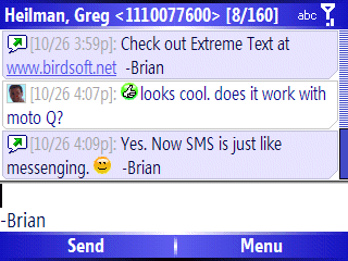 Разработчик программного обеспечения BirdSoft выпустил программу Extreme Text для смартфонов на базе Windows Mobile. Приложение призвано упростить общение по SMS, позволяет просматривать все сообщения для каждого отдельного контакта как отдельную беседу, наподобие чатов и бесед в IM-мессенджерах. Среди дополнительных функций программы: - Использование смайликов - Выделение ссылок в тесте и возможность открыть их - Поддержка отображения фото контакта - Вставка определяемого пользователем текста - Автоматическая замена строчных букв прописными - Цветовые темы - Работа с существующими базами данных Windows Mobile Поскольку Extreme Text работает со стандартными базами данных, пользователь сможет в любое время вернуться к стандартной программе работы с SMS без потерь сообщений. Программа поддерживает смартфоны, работающие под управлением Windows Mobile 5.0 Smartphone и Windows Mobile 6 Standard. Стоимость полной редакции составляет 12,95 долларов. Как обычно, в ближайшее время, демо-версию BirdSoft Extreme Text 1.0 можно будет найти в разделе "Программы для КПК" на HPC.ru.