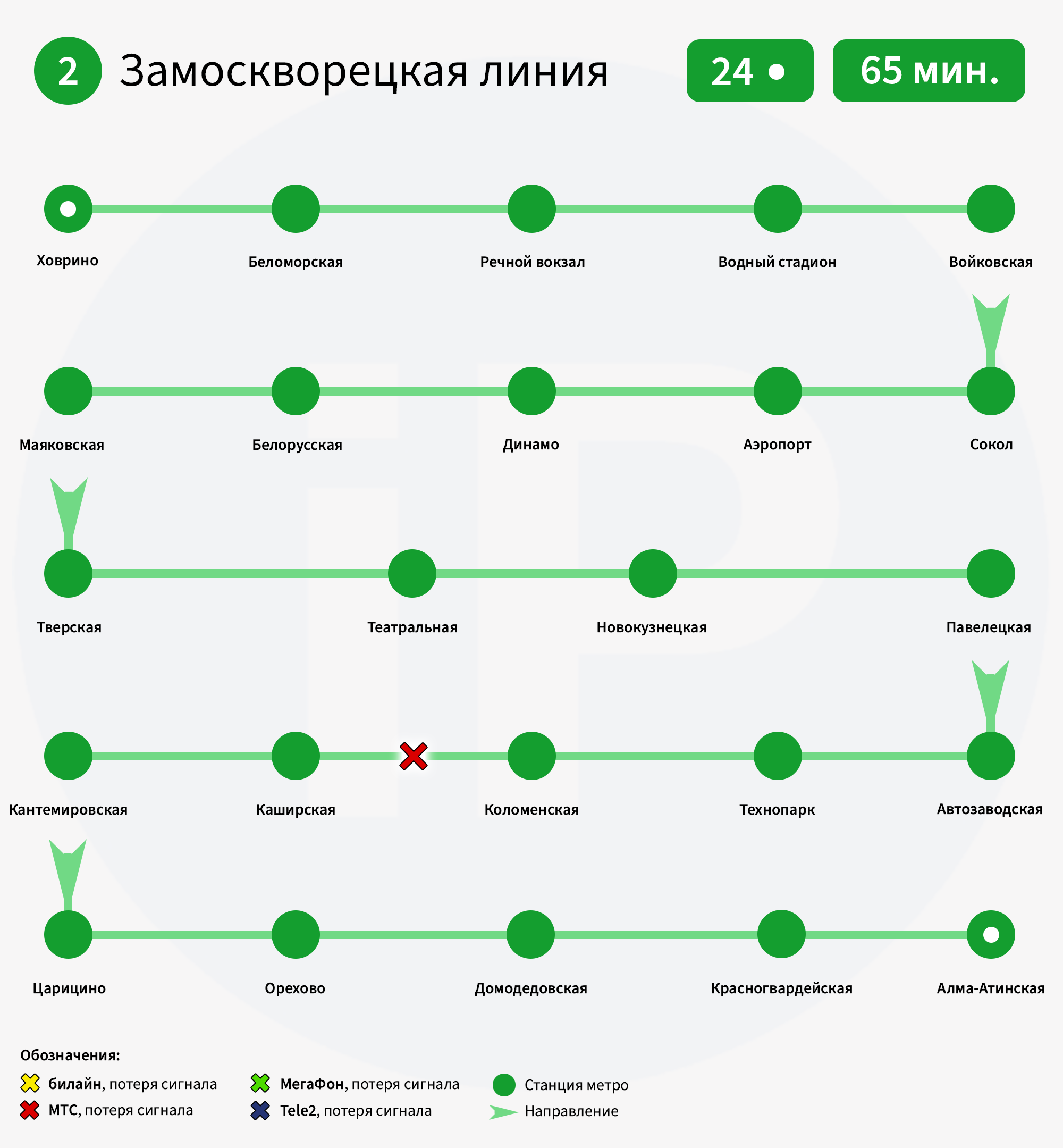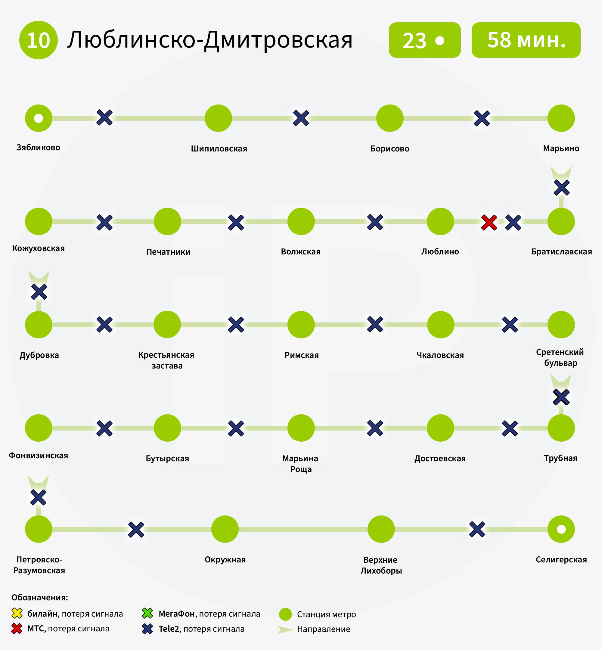 • Tele2: 21 (Зябликово — Шипиловская, Шипиловская — Борисово, Борисово — Марьино, Марьино — Братиславская, Братиславская — Люблино, Люблино — Волжская, Волжская — Печатники, Печатники — Кожуховская, Кожуховская — Дубровка, Дубровка — Крестьянская Застава, Крестьянская Застава — Римская, Римская — Чкаловская, Чкаловская — Сретенский бульвар, Сретенский бульвар — Трубная, Трубная — Достоевская, Достоевская — Марьина Роща, Марьина Роща — Бутырская, Бутырская — Фонвизинская, Фонвизинская — Петровско-Разумовская, Петровско-Разумовская — Окружная, Верхние Лихоборы — Селигерская)