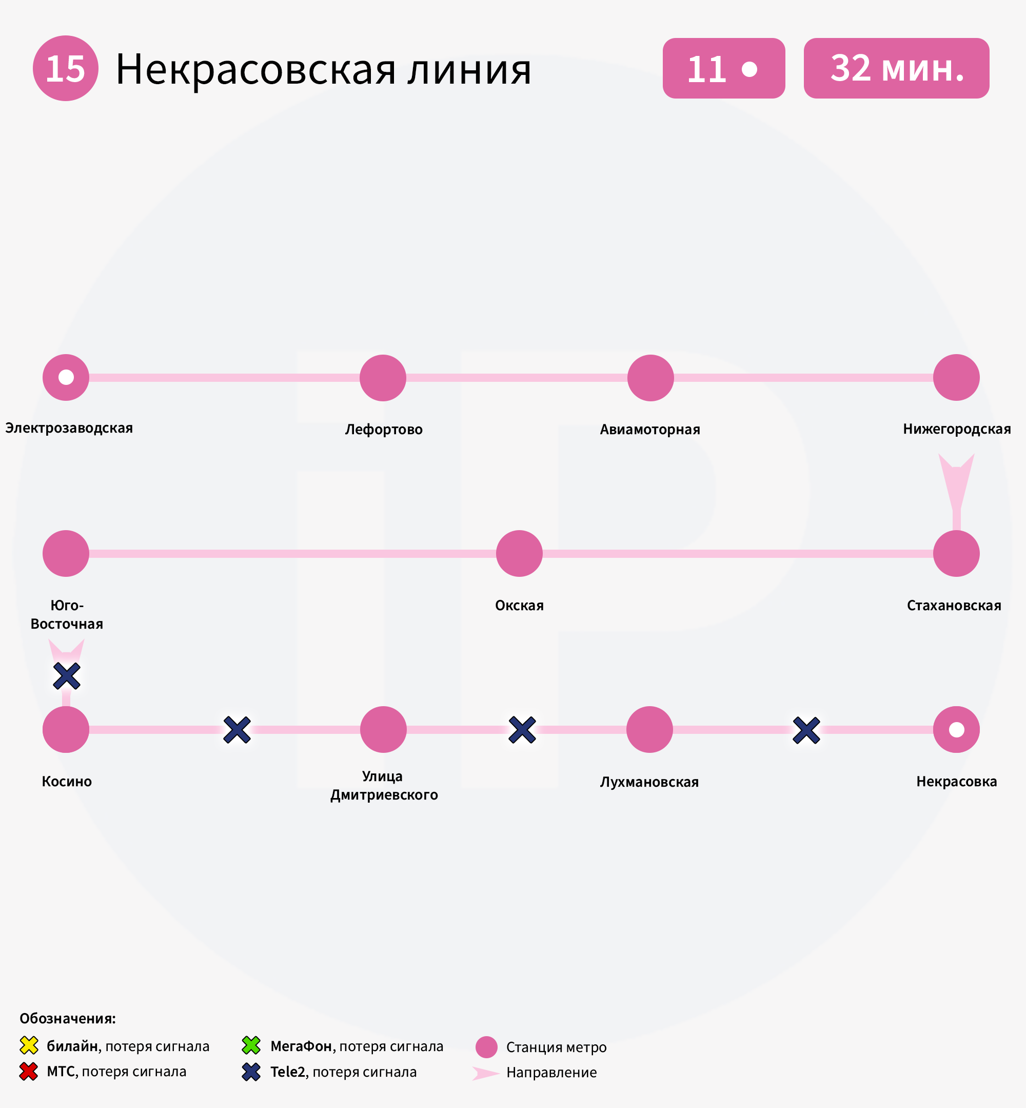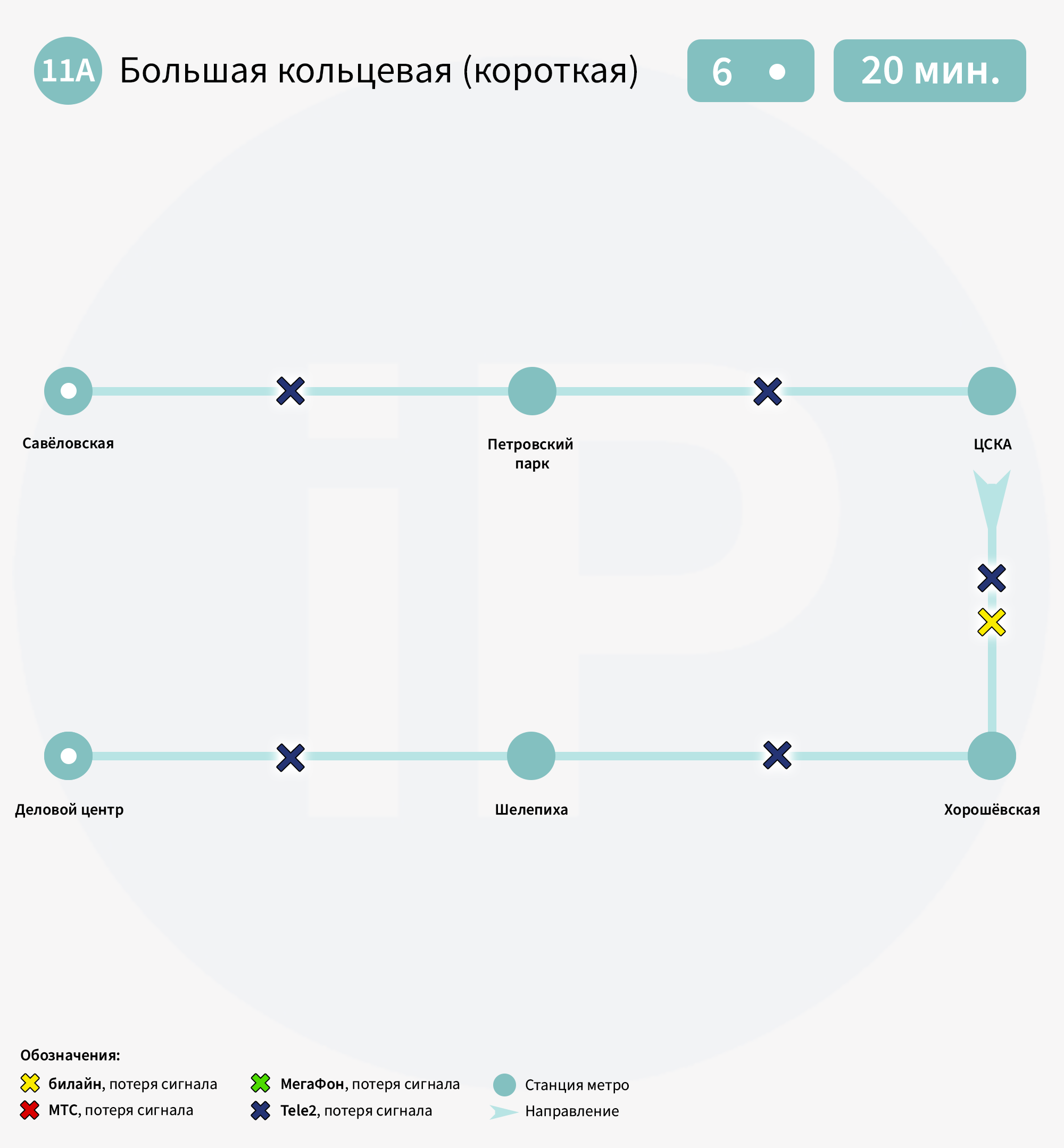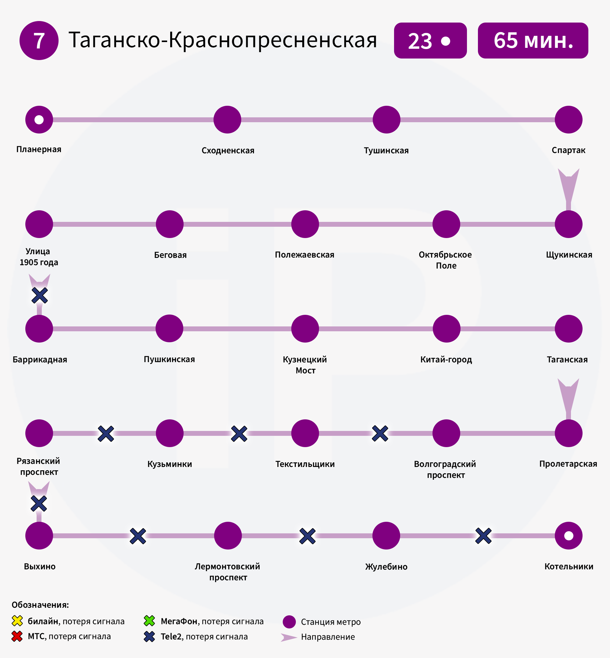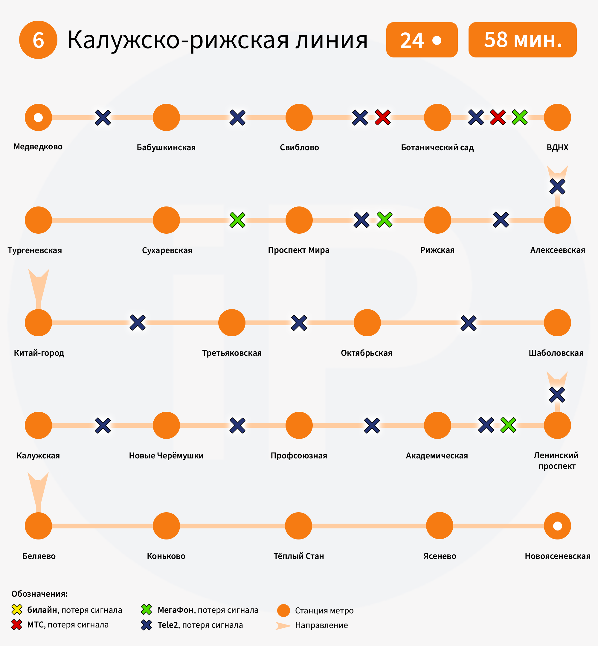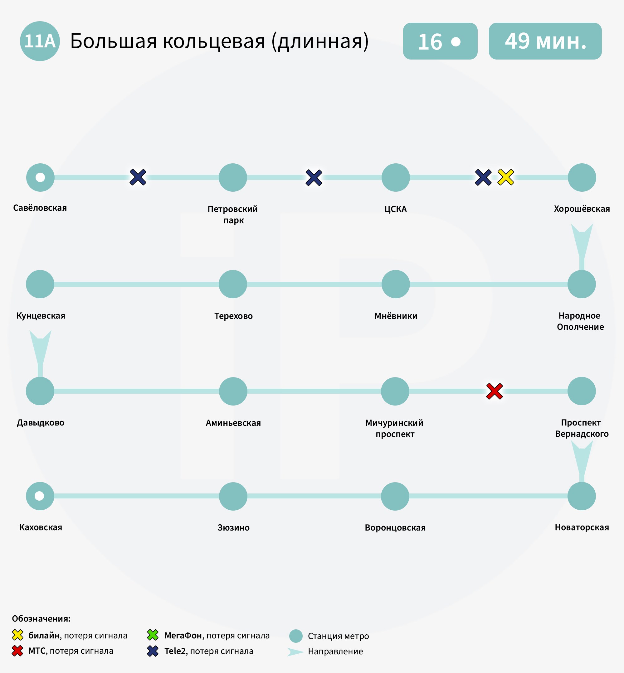 Количество разрывов указано напротив оператора. В скобках даётся отрезок между станциями, где был зафиксирован разрыв. Штучные ситуации потери сигнала мы заметили и в ходе остановок на станциях. Это мы прописали аналогичным образом, рядом с отрезками.