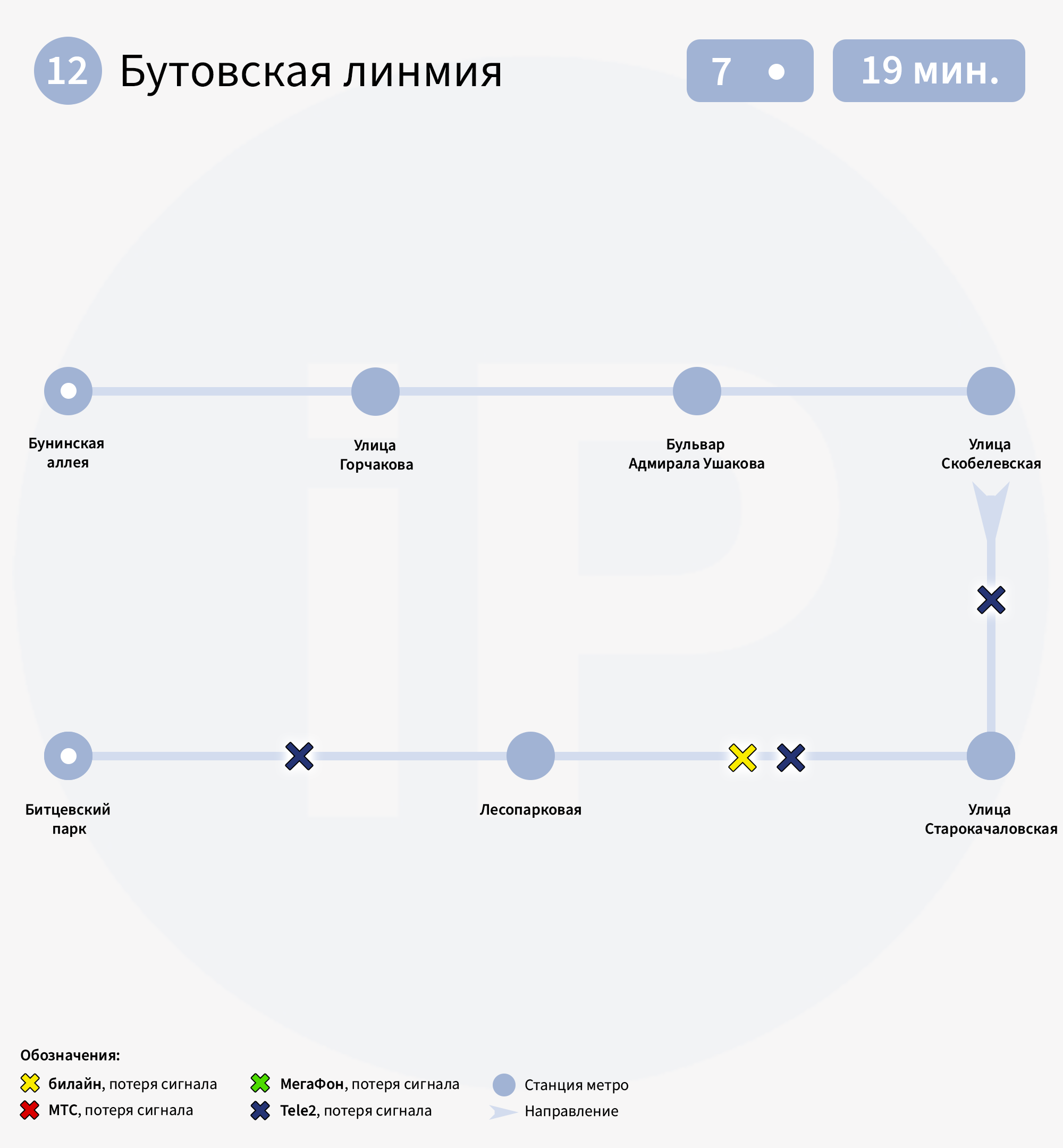 • Tele2: 3 (Скобелевская — Старокачаловская, Старокачаловская — Лесопарковая, Лесопарковая — Битцевский парк)