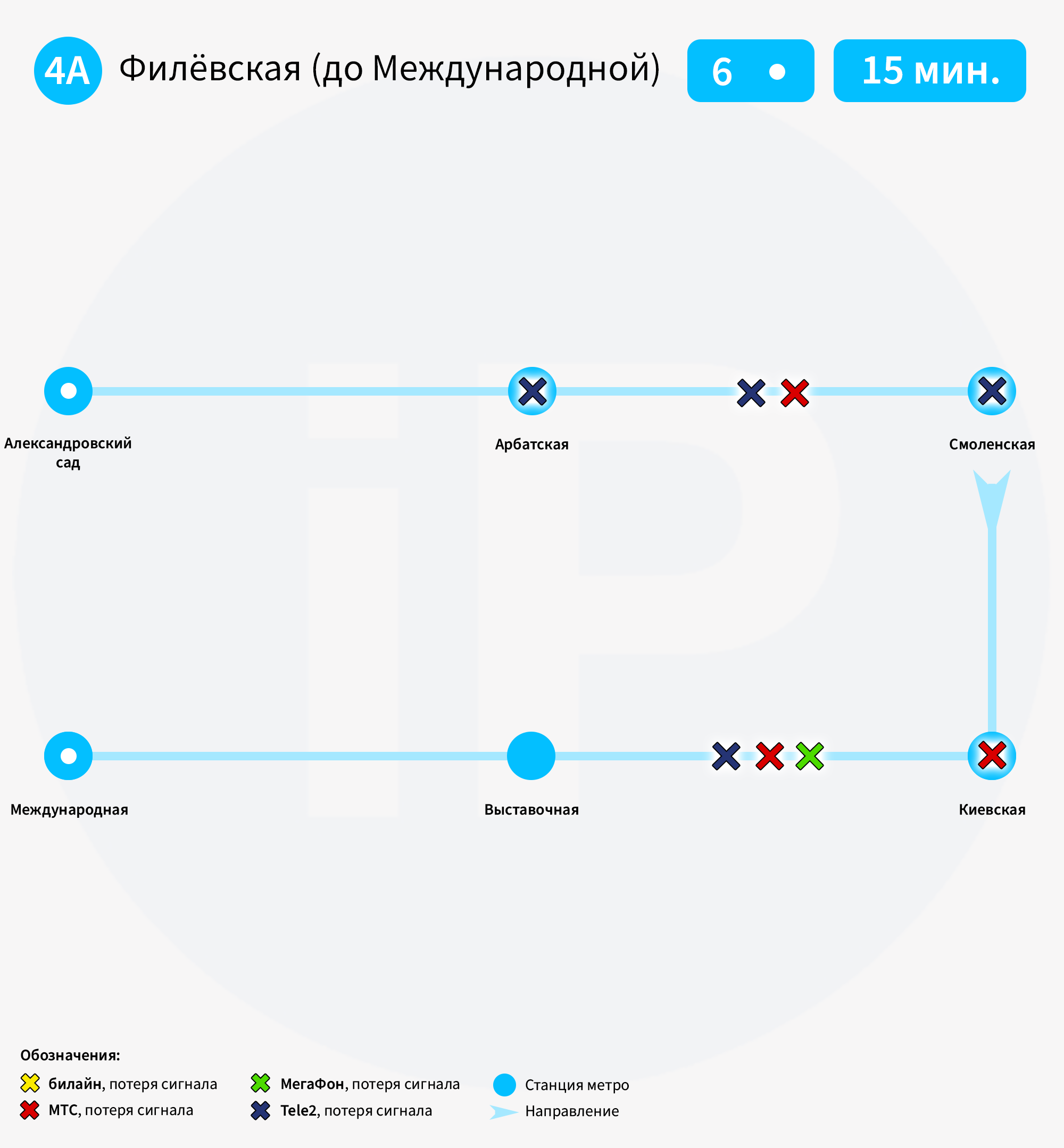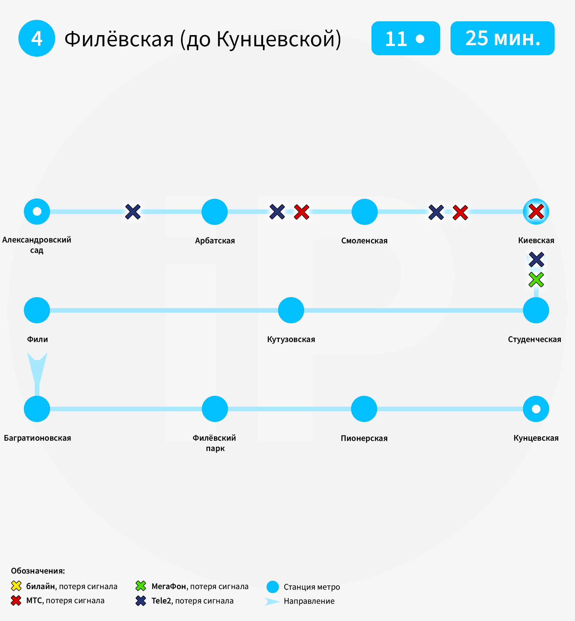 • Tele2: 4 (Александровский сад — Арбатская, Арбатская — Смоленская, Смоленская — Киевская, Киевская — Студенческая)