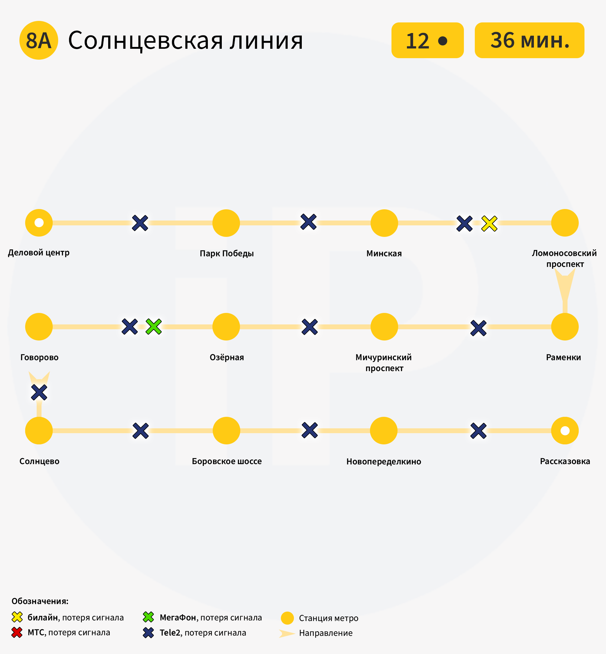 • Tele2: 10 (Деловой центр — Парк Победы, Парк Победы — Минская, Минская — Ломоносовский, Раменки — Мичуринский, Мичуринский — Озерная, Озерная — Говорово, Говорово — Солнцево, Солнцево — Боровское шоссе, Боровское шоссе — Новопеределкино, Новопеределкино — Рассказовка)
