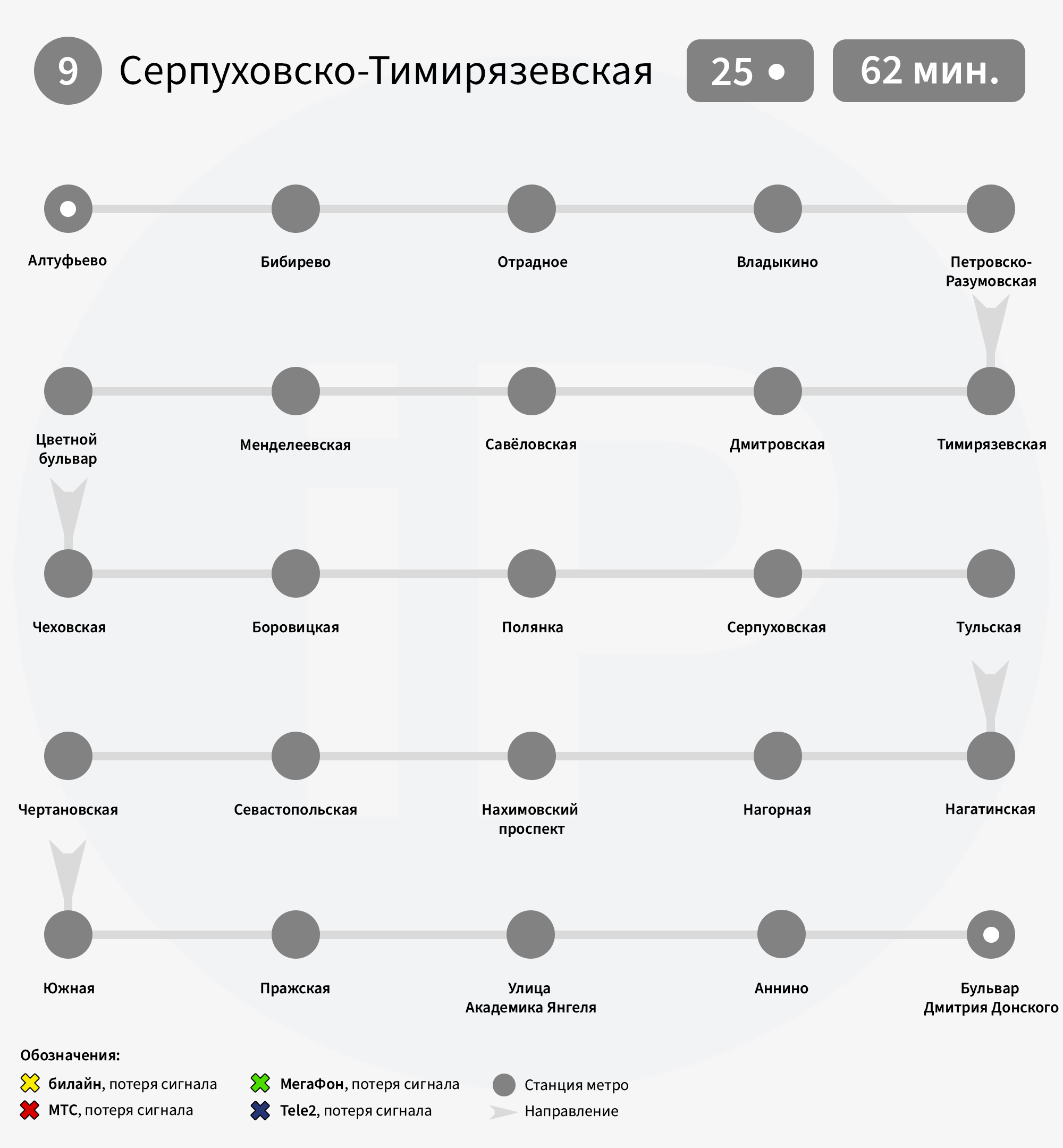 • Tele2: 15 (Медведково — Бабушкинская, Бабушкинская — Свиблово, Свиблово — Ботанический сад, Ботанический сад — ВДНХ, ВДНХ — Алексеевская, Алексеевская — Рижская, Рижская — Проспект Мира, Китай-город — Третьяковская, Третьяковская — Октябрьская, Октябрьская — Шаболовская, Шаболовская — Ленинский проспект, Ленинский проспект — Академическая, Академическая — Профсоюзная, Профсоюзная — Новые Черёмушки, Новые Черёмушки — Калужская)