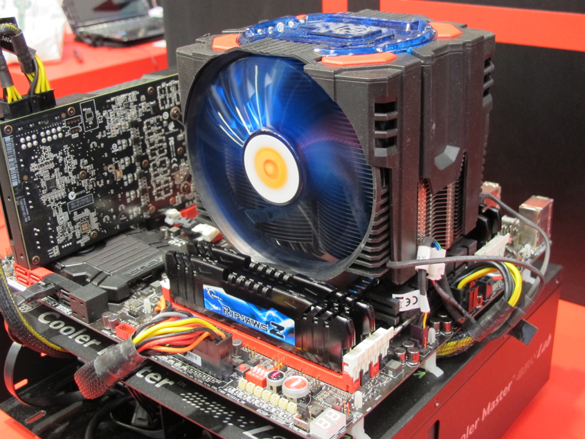 К числу таких процессоров относятся, к примеру, модели Intel Sandy Bridge-E в исполнении LGA 2011, дебютировавшие минувшей осенью, одна из которых, к слову, входила в состав демонстрационного стенда. Речь в данном случае идет о флагманском шестиядерном чипе Intel Core i7-3960X с тактовой частотой 3,3 ГГц, который вкупе с материнской платой ASUS ROG Rampage IV Extreme на чипсете Intel X79 и обеспечивает работоспособность системы, за охлаждение которой отвечает габаритный кулер. Возвращаясь к главному герою этой заметки, стоит отметить, что уровень таймингов набора памяти DDR3 2666 равен CL10-12-12-31, а напряжение питания – 1,65 вольта.