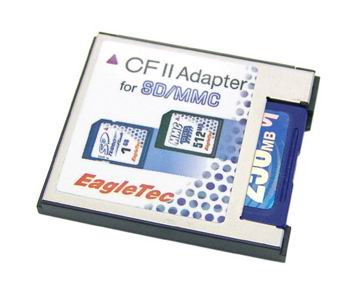 В продажу поступил адаптер EagleTec CF to SD/MMC Adapter, позволяющий использовать карты памяти SD или MMC в устройствах, оснащенных слотом CompactFlash Type II. Адаптер может пригодиться владельцам КПК или фотокамер со слотом CF, которые не хотят использовать карты разных стандартов, имея другие устройства, использующие карты SD. Возможно, кому-то захочется иметь 2 слота SD в своем Pocket PC. Купить адаптер можно в Интернет-магазине по цене $25.