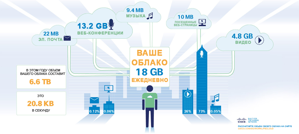 Цифры настолько огромные, что в представления обычного человека не укладываются. Между тем, учитывая стремительное распространение облачных технологий, компания Cisco разработала веб-раздел, где можно не только определить степень их влияния на повседневную жизнь любого пользователя, но и в считанные минуты нарисовать портрет «своего» облака. А те, кому лень это делать, могут полюбоваться на образец, составленный вице-президентом, главным директором компании Cisco по технологиям облачных вычислений Лью Такером (Lew Tucker). Использовав вышеупомянутую веб-страницу, он обнаружил, что его ежедневный рацион облачного трафика в среднем составляет 18 гигабайт. Графически это выглядит так: