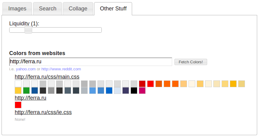 Ну, и для самых отъявленных цветовых плагиатчиков на Colr.org есть инструмент для извлечения цветовой схемы из готового сайта. Вот, например, такие цвета у нас сегодня: