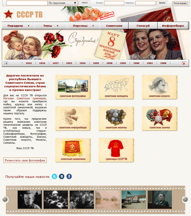 Архивы - это такая информация, которую часто хочется навсегда забыть, но изредка приятно ненадолго вспомнить. На СССР ТВ пытаются собрать архив самой разнообразной совковой ерунды от анекдотов про Хрущёва и Рабиновича до значков и монет, однако лучше всего на этом сайте представлены видеоматериалы советского времени.