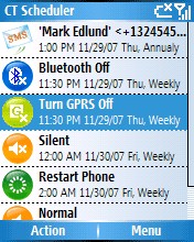 Компания Connective Tools выпустила версию 2.0 приложения CT Scheduler. Оно предназначено для смартфонов под управлением операционной системы Windows Mobile 5 и 6. Эта полезная утилита позволит автоматизировать некоторые телефонные функции смартфона. Например, среди возможностей CT Scheduler - отправка SMS, переключение профилей, включение и отключение Bluetooth, Режима Полета (Flight Mode), переадресация вызовов и даже перезагрузка и выключение телефона в заданное время. Программу можно настроить по своему усмотрению и она будет производить необходимые действия самостоятельно, без помощи пользователя. В приложении удобно просматривать, редактировать, создавать и удалять события. В свою очередь, множество настроек, включая пиктограммы, фильтры, сортировку и т. д., позволяют легко организовывать список событий. Стоимость CT Scheduler 2.0 составляет 9,75$. Демо-версию программы, как обычно, вскоре можно будет найти в разделе "Программы для КПК" на HPC.ru.