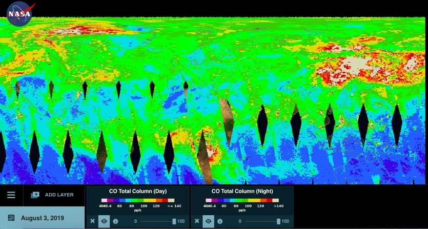 На карта выше изображено содержание угарного газа в атмосфере 8 августа 2019 года.