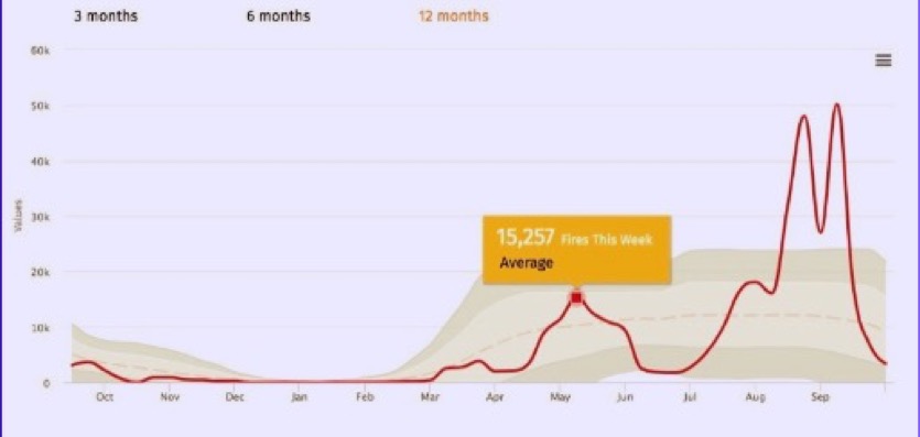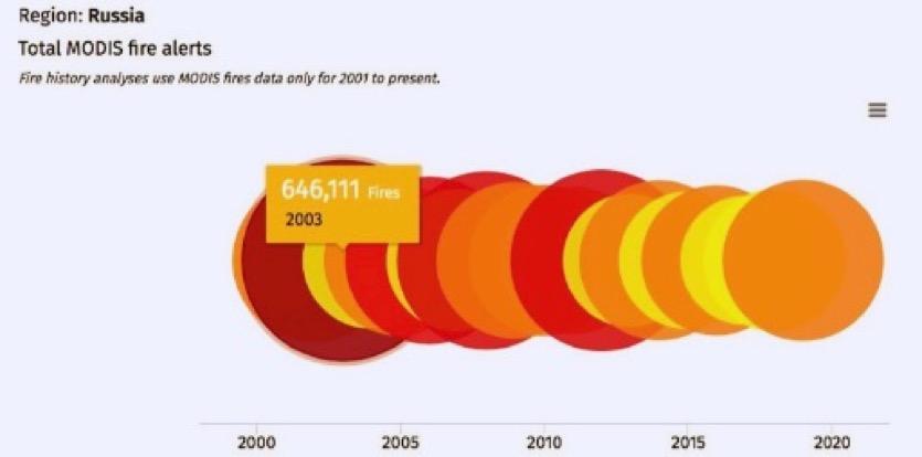 На графике отображаются только пожары, зафиксированные MODIS, а на других изображениях — MODIS+VIIRUS, поэтому цифры несколько разные.