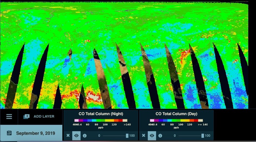 Концентрацию угарного газа в атмосфере можно в режиме реального времени смотреть на сайте NASA AIRS. Ещё там есть карта содержания оксида серы (например, в Черноземье там окрашено ярко-красным цветом)