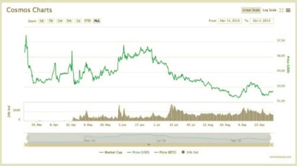 Криптовалюта Cosmos 5 сентября 2019 года стоила $1.95, а 16 сентября $3.53. 45% прибыли за 11 дней.
