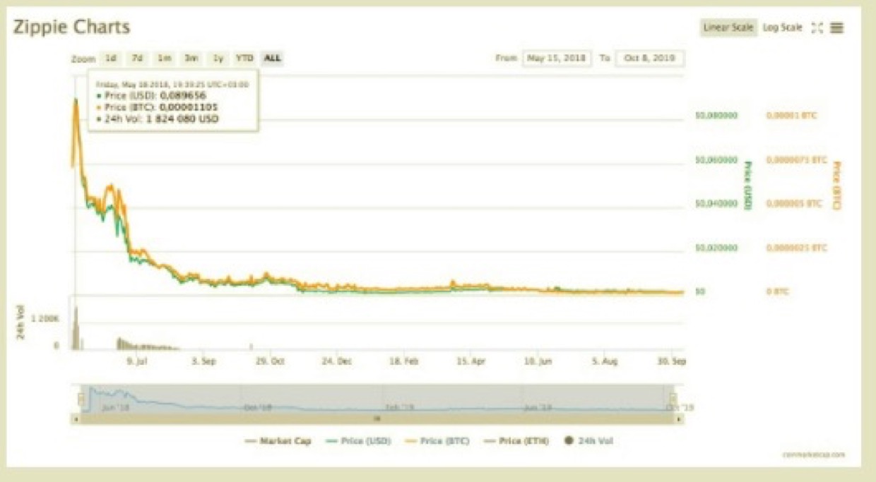 На графике выше динамика изменения стоимости альткоина Zippie с июля 2018 года по сентябрь 2019 года. Создатели вложили в неё миллионы долларов, но всего за несколько месяцев инвестиции обесценились в десятки раз, не выдержав конкуренции с лидерами рынка.