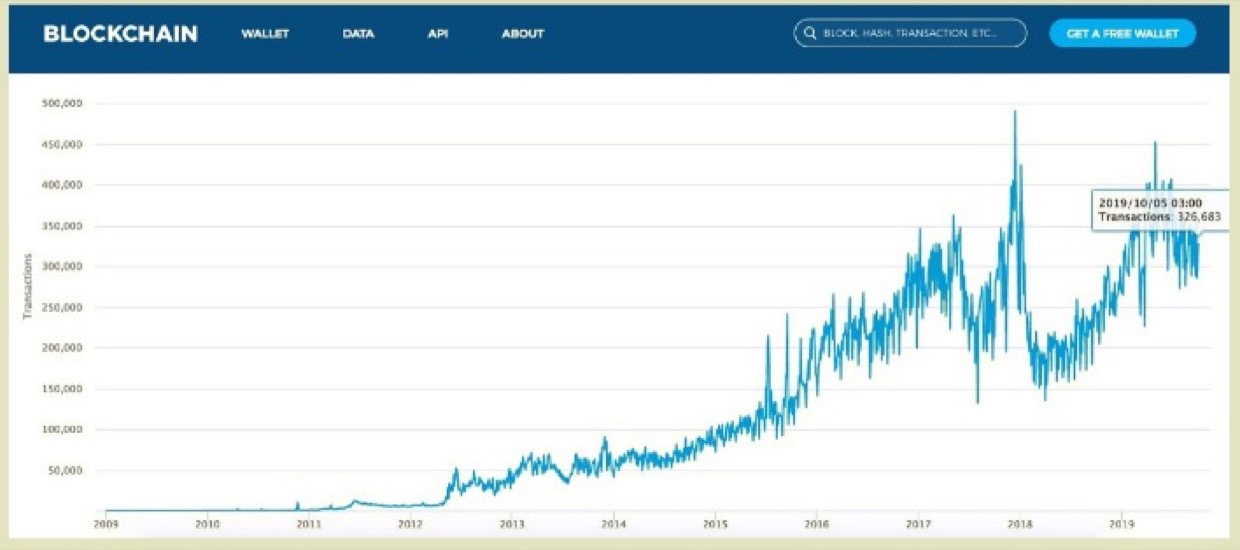 Несмотря на разговоры о «крахе», «смерти» и «закате эпохи» биткоин, в 2019 году, в среднем, каждый день совершалось по 300–350 тысяч переводов между BTC-кошельками во всём мире (максимум в этом году — 452 тысячи (2 мая)).