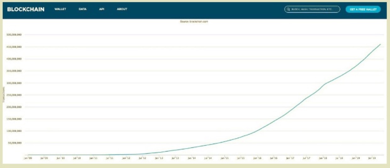 По данным сайта blockchain.com, с 1 января 2009 по 8 октября 2019 года было совершено 462 миллиона 605 тысячи 970 транзакций. На графике наглядно видно как росло это число с июня 2009 по октябрь 2019.