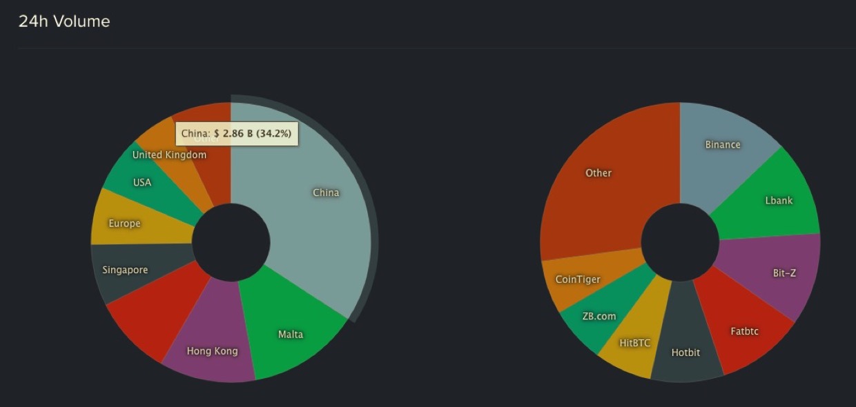 Ещё на coinlib.io можно посмотреть долю от общего объема операций с криптовалютами на биржах разных стран. 34.2% приходится на Китай, 11.2% на Гонконг и 7.2% на Сингапур. Также в лидерах США (6.5%), Великобритания (5%) и Мальта (12.9%).