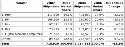 Аналитики компании IDC подвели итоги прошедшего 2 квартала. На рынке классических карманных компьютеров (без поддержки сотовой связи) никаких сенсаций не произошло - он продолжает стремительно сокращаться. Отдельные поставщики выиграли в доле рынка, но лишь за счёт выхода компании Dell из игры. Всего за квартал было продано 720 тыс. КПК, что представляет снижение на 43,5% по сравнению с аналогичным кварталом год назад и на 21,8% по сравнению с первым кварталом года. Это уже второй квартал подряд, когда поставки всех компаний не превысили миллиона КПК. В число лидеров рынка КПК входят компании Palm, HP, Mio, Dell и Fujitsu-Siemens Computers. Традиционно на долю Palm приходится почти половина всех продаж (44,1%). Причём после 3 кварталов последовательного спада, продажи КПК, наконец, возросли по отношению к предыдущему кварталу, но даже лидеру рынка не удалось увеличить продажи по сравнению с прошлым годом. Находящаяся на втором месте HP порадовала экспертов хорошим уровнем продаж, несмотря на снижение объёмов - ожидались результаты ещё хуже. Это связывают в первую очередь с уходом с рынка КПК компании Dell. Компания Mio демонстрирует рост поставок уже 4 квартал подряд, здесь сказывается удачно выбранное направление с навигационными КПК. Dell остаётся в пятерке крупнейших поставщиков лишь поскольку продолжает распродавать запасы серии Axim. Fujitsu-Siemens, завершающая рейтинг, единственная из всей пятерки акцентирует своё внимание на Западной Европе, не распыляясь на планы по "захвату мира".